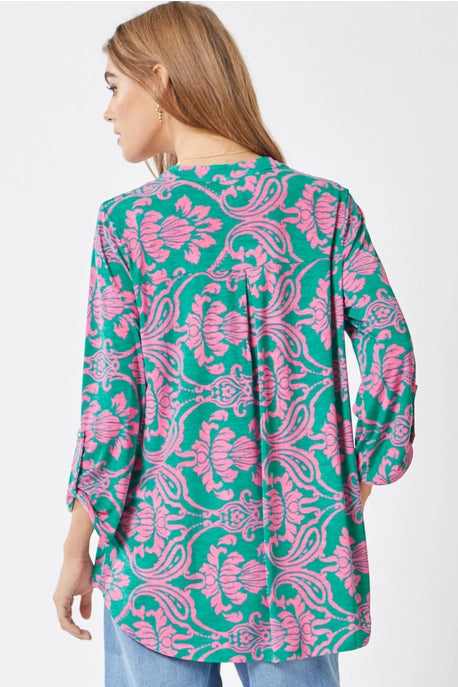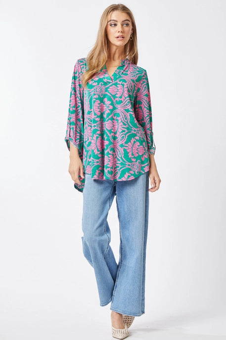 Top features poly blend which features luxurious softness with lightweight, wrinkle free comfort. This easy care fabric top is travel friendly, cooler than linen and other materials which makes your perfect ON THE GO wear. This blouse also features China collar neckline with 3/4" length sleeves with tab details. The fit is relaxed, flowy fit with slight high low.